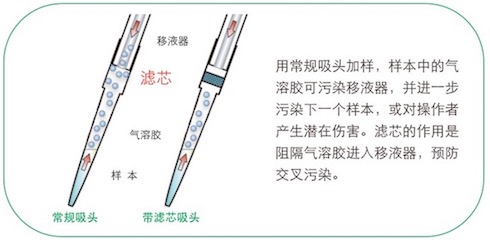 在吸液的过程中,液体的扰动,包括流动、飞溅、挂壁、吹出余液等动作会产生气溶胶(aerosol)。气溶胶是由固体或液体小质点分散并悬浮在气体介质中形成的胶体分散体系,固体和液体小质点大小为0.001~100μm,包括液滴、细菌、病毒、支原体、DNA、RNA、超微量分子,比如<100bp的小片段DNA,一些特殊的试剂分子等。气溶胶随着负压形成的通道进入移液器,最后通过两种途径扩散。第一种是吸取下一个样本时,进入下一个样本,通常叫做样本交叉污染;第二种是扩散到空气中,当样本是危险样本时会对操作者造成不利影响,比如在吸取埃博拉和艾滋病病毒样本或者有放射性的样本时。